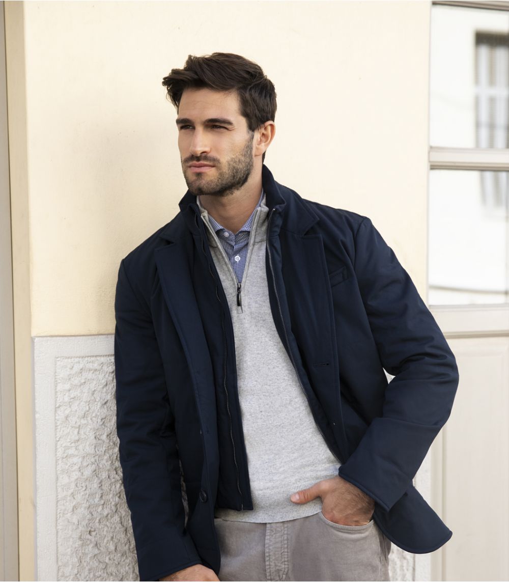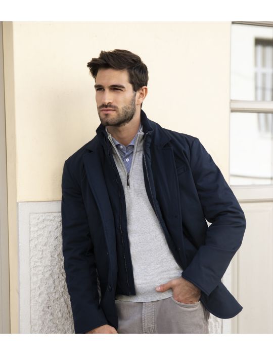 Σακάκι μπλε σκούρο regular fit με αποσπώμενο εσωτερικό που κλείνει με φερμουάρ της συλλογής ΦΧ25. Σύνθεση:92% Polyester -8% Spandex . .